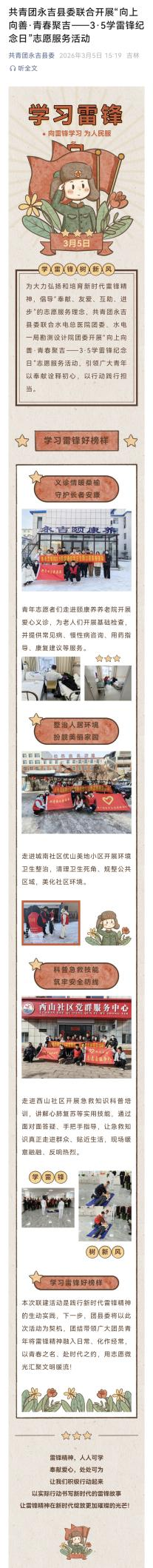 为大力弘扬和培育新时代雷锋精神,倡导“奉献、友爱、互助、进步”的志愿服务理念,共青团永吉县委联合水电总医院团委、水电一局勘测设计院团委开展“向上向善·青春聚吉——3·5学雷锋纪念日”志愿服务活动,引领广大青年以奉献诠释初心,以行动践行担当。 义诊情暖桑榆,守护长者安康:青年志愿者们走进颐康养养老院开展爱心义诊,为老人们开展基础检查,并提供常见病、慢性病咨询、用药指导、康复建议等服务。 整治人居环境,扮靓美丽家园:走进城南社区优山美地小区开展环境卫生整治,清理卫生死角、规整公共区域,美化社区环境。 科普急救技能,筑牢安全防线:走进西山社区开展急救知识科普培训,讲解心肺复苏等实用技能,通过面对面答疑、手把手指导,让急救知识真正走进群众、贴近生活,现场暖意融融、反响热烈。 本次联建活动是践行新时代雷锋精神的生动实践,下一步,团县委将以此次活动为契机,团结带领广大团员青年将雷锋精神融入日常、化作经常,以青春之名、赴时代之约,用志愿微光汇聚文明暖流! |