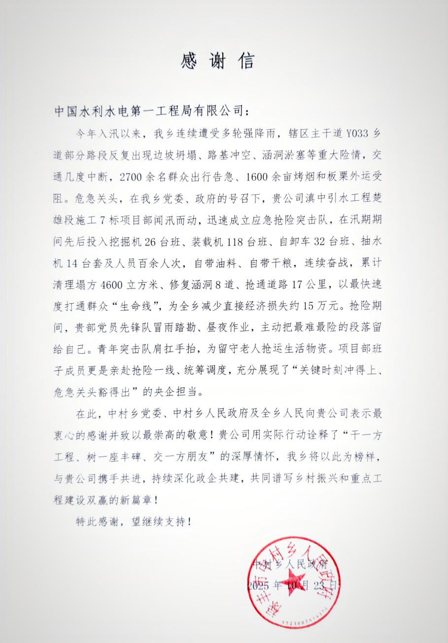 10月24日上午,中村乡党委书记张国华一行将盖有鲜红公章的感谢信郑重送到滇中引水项目部,会议室掌声雷动,这不仅是对项目部全体人员辛勤付出的高度认可,更是政企同心、共克时艰的生动见证。 今年主汛期,楚雄州中村乡连遭暴雨,Y033乡道边坡坍塌、路基冲空、涵洞淤塞,交通几度中断,2700余名群众出行受阻,1600余亩烤烟、板栗外运告急。险情传来,项目部立即启动应急机制,先后投入挖掘机26台班、装载机118台班、自卸车32台班、抽水机14台套及人员百余人次,自带干粮、自带油料,人停机不歇,冒雨拓宽临时通道、清理塌方土石、加固危险边坡。后续又协助乡政府全面修复乡道,铺设砂石料500余吨,修复涵洞8处,浇筑混凝土挡墙,新装波纹管,栽种防护树苗,昔日“水毁路”变身“安全路”“幸福路”。 此次政企携手抢险救灾,充分彰显了一局在关键时刻的责任与担当。项目团队始终秉持“人民至上、生命至上”的理念,将群众急难愁盼放在心上,用实际行动诠释了“干一方工程、树一座丰碑、交一方朋友”的深厚情怀。 滇中引水项目部将继续发挥专业优势,在推进工程建设的同时,积极投身地方公益事业,深化政企合作,为地方经济社会发展贡献一局力量,共同谱写和谐共进的新篇章! |